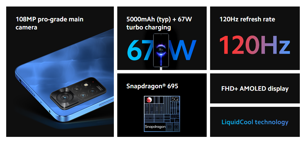 Redmi Note 11 Pro 5GHighlights Incredible Performance5G ArrivedOutstanding Photograph Main CameraMacro CameraUltra Wide Camera 120Hz display gives you a higher refresh rate which will feel smoother and faster to use. Feast Your Eyes With Vibrant Details A massive 5000mAh battery that ensures you don't run out of battery while you are on the go.